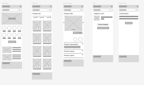 To create a low-fidelity prototype, I mapped out a simple user-flow starting with the homepage, moving to the product page, then adding an item to the cart and checking out.